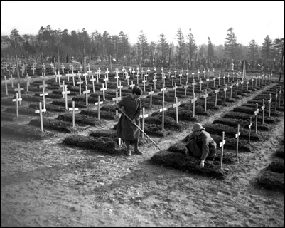 The man lifted his eyes and looked at her with infinite compassion before he turned from the fresh-sown grass toward the naked black crosses. “Come with me” he said “and I will show you where your son lies”.